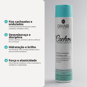 Hidratação, brilho e leveza para seus cachos com o Condicionador Cachos Dihair! Enriquecido com Manteiga de Karité, Pantenol, Extrato de Chia e Linhaça, ele desembaraça os fios com facilidade, controla o frizz e garante definição com toque macio e sedoso. Desenvolvido especialmente para cabelos cacheados, ondulados e afro, proporciona emoliência e hidratação duradoura, deixando os cachos leves, nutridos e disciplinados. 💧✨👩🏾🦱