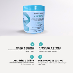 A Gelatina Cachos foi desenvolvida para quem está em busca de fixação intensa dos cachos. Possui em sua formulação pantenol (pró-vitamina B5) e um blend de aminoácidos que também vão garantir hidratação, nutrição, ativação e definição, ação anti frizz, maciez, brilho intenso e manter a fibra capilar forte e saudável, prevenindo a quebra.