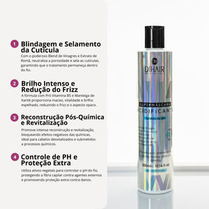 Benefícios: Controle de PH, reconstrução, selamento das cutículas, brilho e proteção térmica.